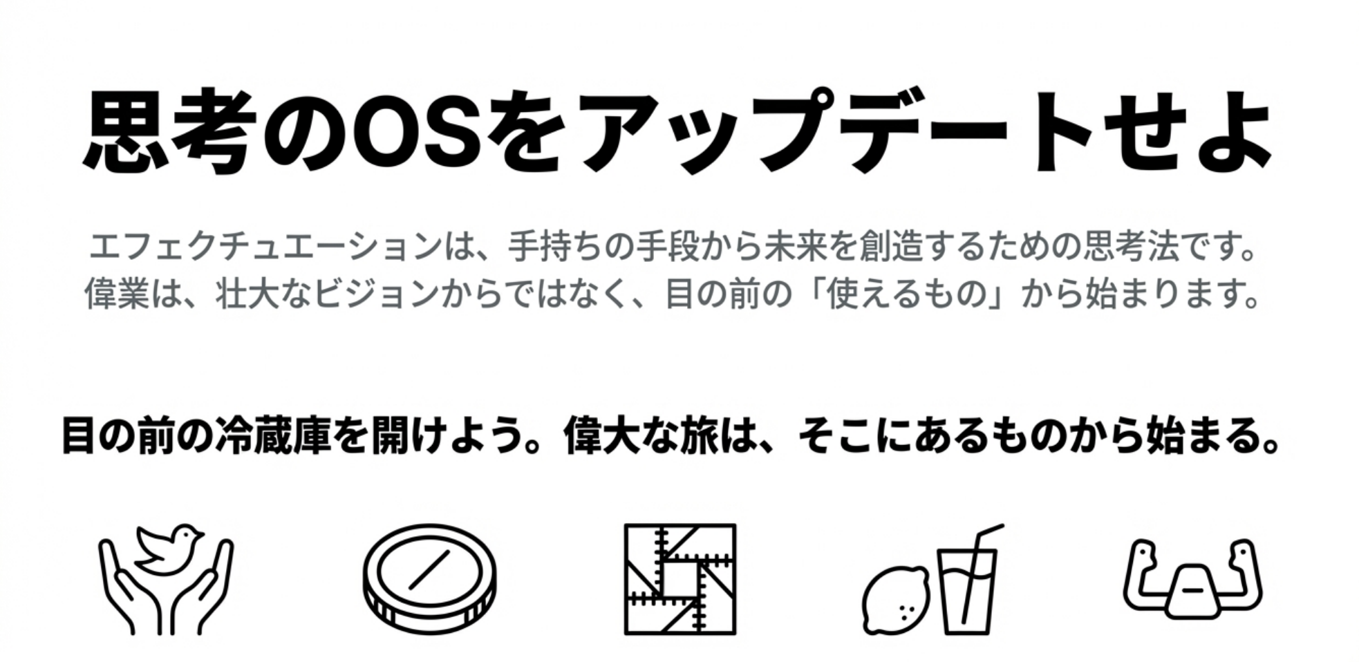 偉業は、壮大なビジョンからではなく、目の前の「使えるもの」から始まっています。あなた自身のスキル、知識、そして人脈(冷蔵庫の中身)に眠る可能性に気づき、小さな実験を繰り返すこと、これこそが、この不確実性の時代にイノベーションを起こすための鍵となります。